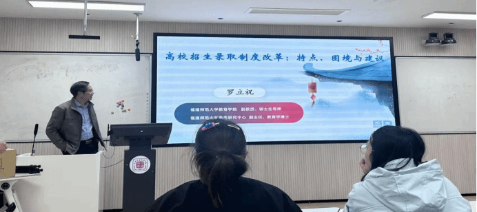 10月24日下午,福建师范大学高考研究中心副主任、教育学院硕士生导师罗立祝副教授应邀在W1409为学部研究生作题为《高校招生录取制度改革:特点、困境与建议》的学术报告。报告由高等教育研究所所长吴根洲教授主持。