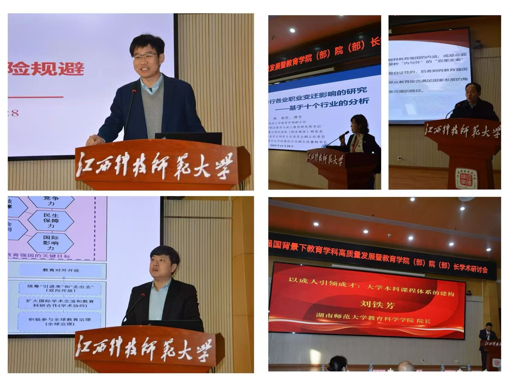 上半场,湖南师范大学教育科学学院院长刘铁芳以“成人与成才:大学课程的思考”为题、北京师范大学教育学部副部长宋萑以“落实教育强国建设规划纲要 铸就新时代大国良师”为题、华东师范大学教育学部副主任匡瑛以“省域职业教育体系建设研究:路径探索、特色构建与未来展望”为题、陕西师范大学教育学部副部长胡金木以“人工智能赋能青少年情感发展及其风险规避”为题、首都师范大学教授张爽以“教育强国背景下师范院校教师教育的挑战与思考”为题分别作主题报告。